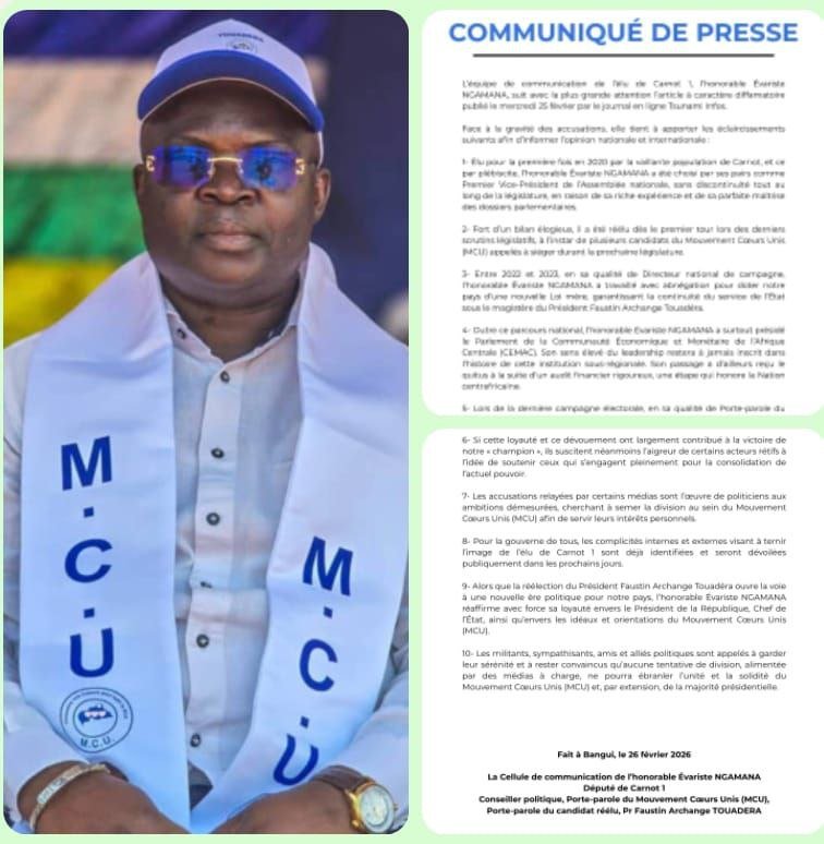 Bangui, 26 février 2026 – (Eclipse d’Afrique) : L’honorable Évariste Ngamana, député de Carnot 1, se trouve au centre de vives discussions après un article controversé publié par Tsunami Infos. C’est ainsi que sa cellule de communication a réagi fermement aux allégations, soulignant les accomplissements significatifs du député Evariste Ngamana à travers un communiqué de presse.