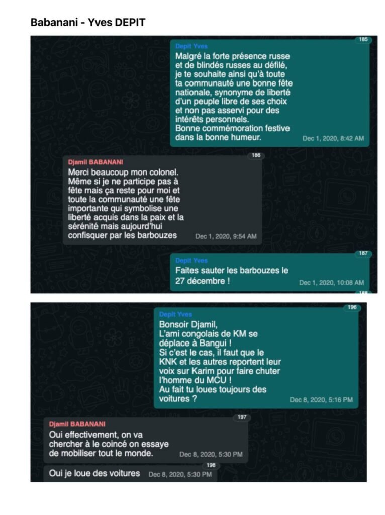 Les contacts de Babanani avec l’ancien attaché militaire de la France en RCA, Yves Dépit confirment les velléités destructives qu’il nourrit. Dans des correspondances entre Babanani et les services français, il en ressort des faits qui mettent clairement en lumière les manigances de ce dernier avec les autorités françaises. Dans le cadre de ses communications, on se rend compte qu’il ne s’agit pas de simples commentaires, mais qu’il est un acteur qui prend au projet de déstabilisation de la RCA.