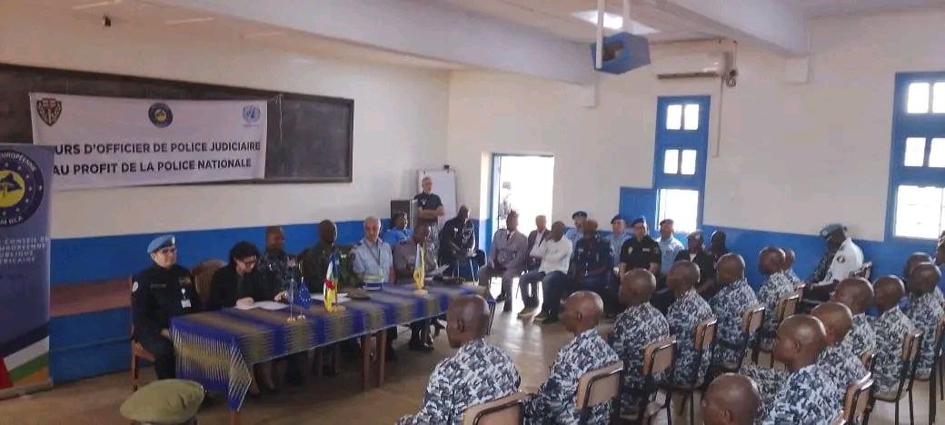 Le programme, d’une intensité de 34 heures par semaine, alterne entre modules théoriques et pratiques, afin de développer les compétences juridiques essentielles des participants. Cette cohorte a été soigneusement sélectionnée à travers un concours national organisé dans sept centres clés, notamment Bangui, Berbérati, et Bouar. Sur les 181 candidats admis, 100 ont intégré la formation, complétés par 10 auditeurs libres désignés par la Direction générale de la police nationale (DGPN).